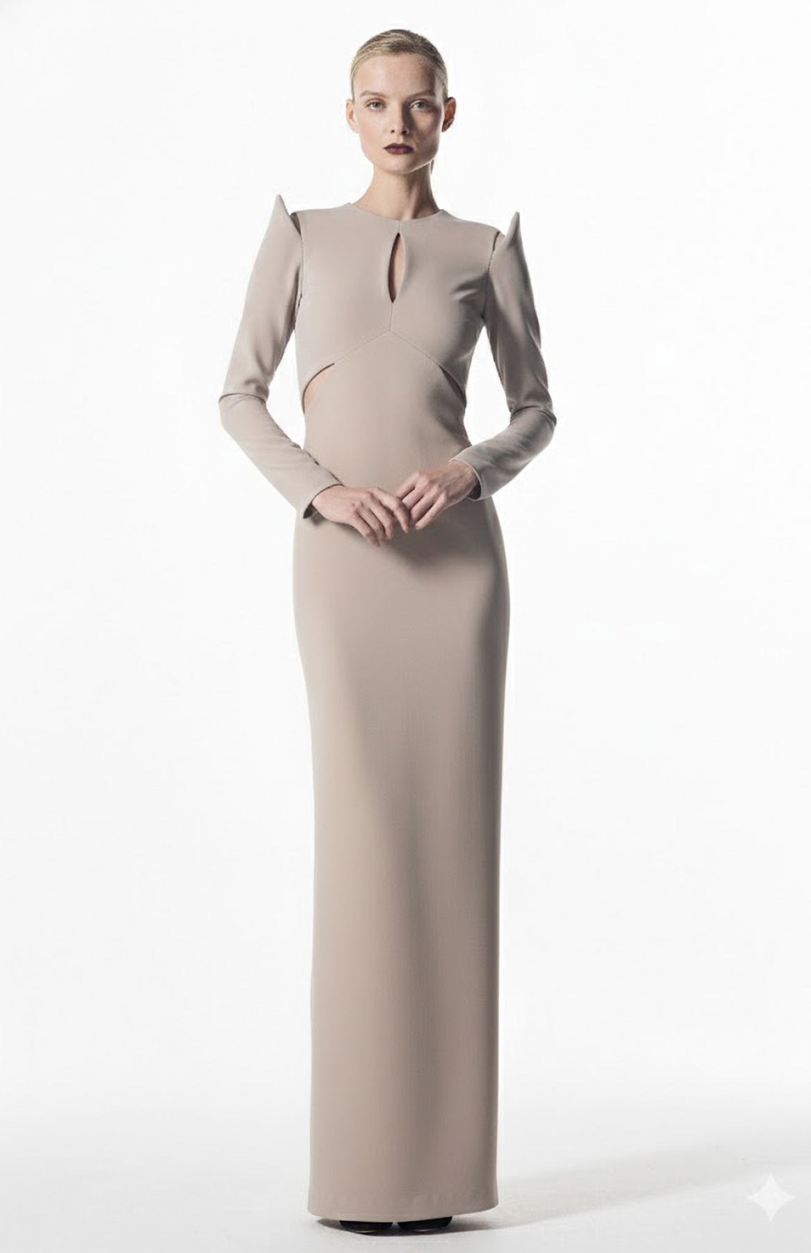 A long fitted dress defined by pronounced shoulders and precise cutouts. Cut close to the body with a clean, controlled line. Finished with a center-back zip closure.
