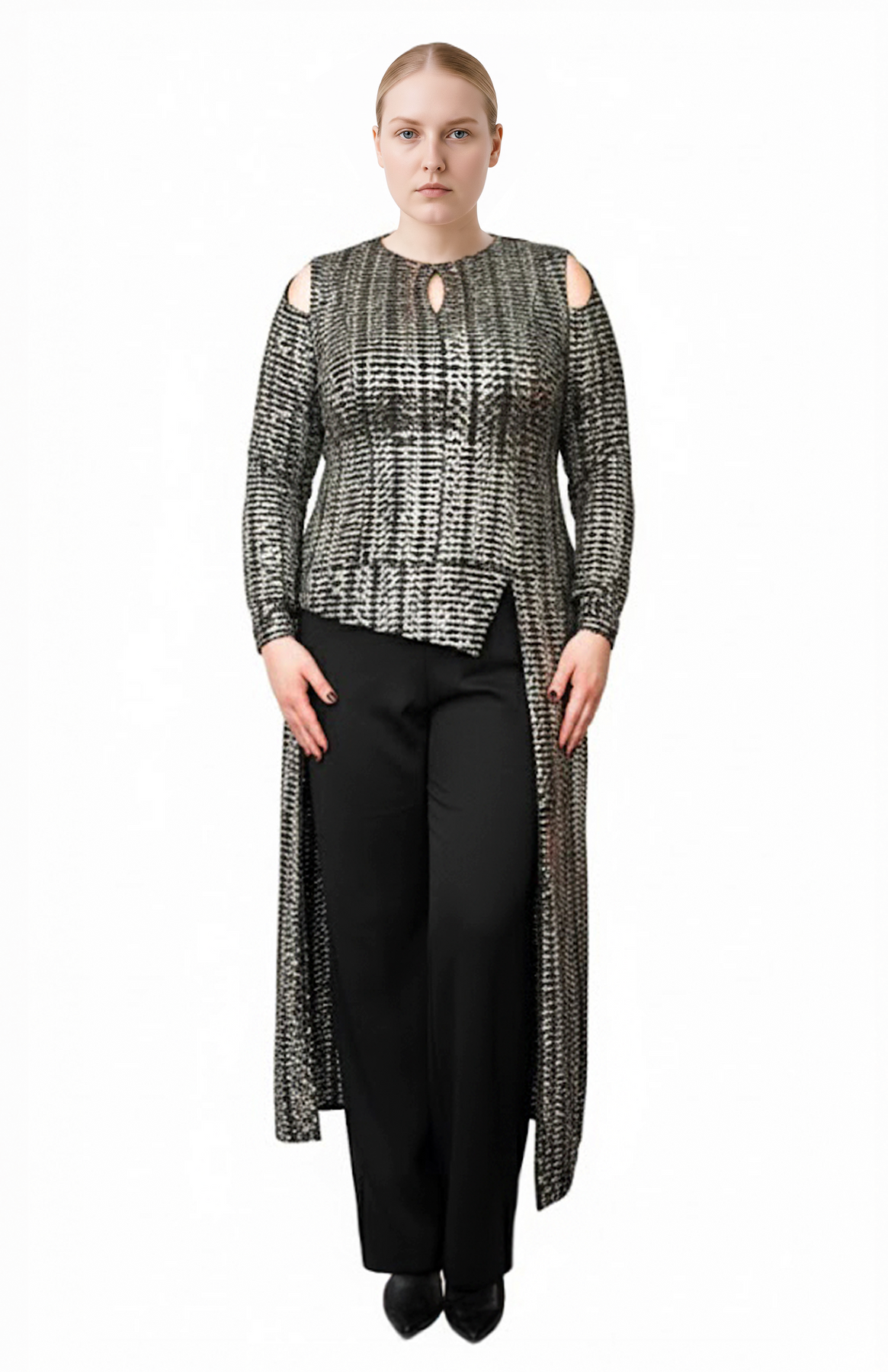 Experience the sophistication of the Cypreea Glam plus size metallic top—a captivating garment designed to turn heads. With its precise geometric lines and striking contours, it commands attention effortlessly. Versatile and comfortable, this top is perfect for any occasion, from formal events to casual outings. Fully lined and featuring a convenient back zipper opening. Watch it move gracefully, mirroring the fluidity of the similar Cypreea sequin top. Elevate your look by pairing it with trousers or a flowing skirt.