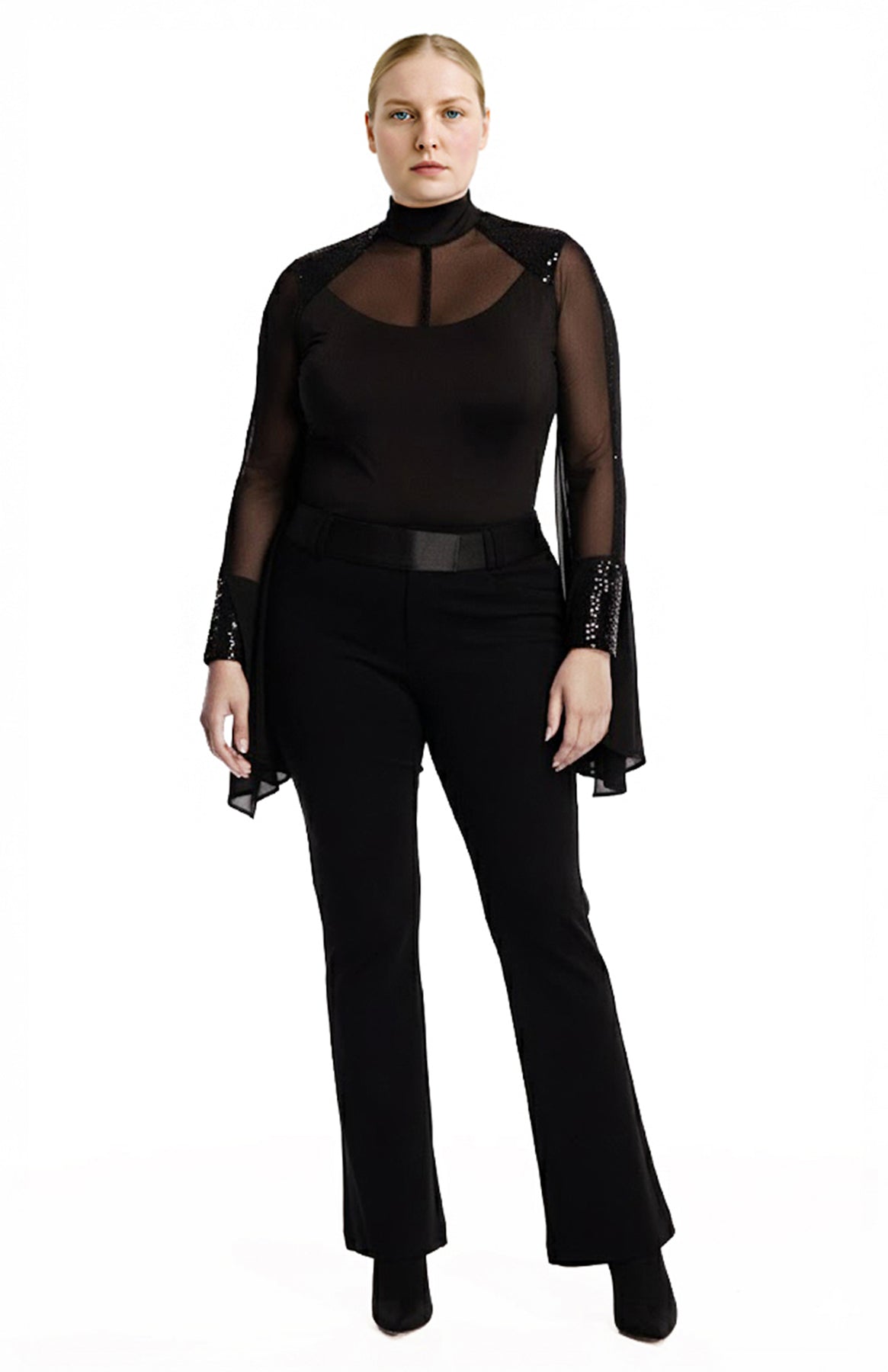 Introducing the Eretria curve bodysuit: a stunning blend of sequin and sheer mesh, exuding elegance. Draped georgette sleeves add drama and grace, while double-layered coverage ensures comfort and flattery. With a center-back zipper for easy wear and adjustable closures for a perfect fit, this plus-size bodysuit commands attention effortlessly.