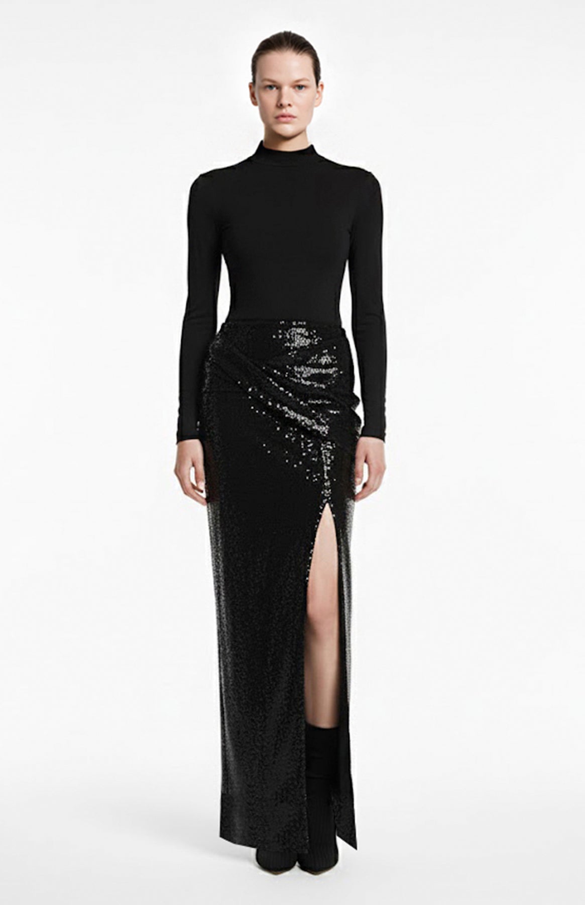 model wearing black turtleneck and long black draped sequin skirt with a slit
