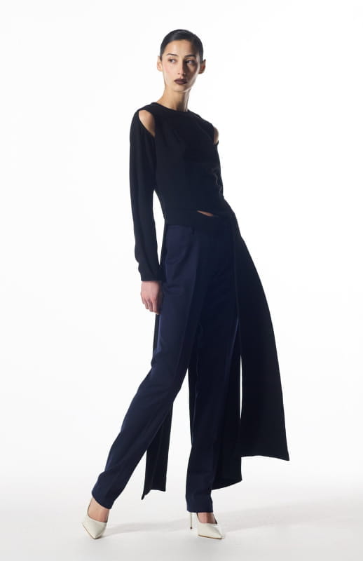 A statement in effortless elegance, the Hera Top is designed to captivate. Sculpted with precision, its strategic cutouts offer a refined edge, balancing structure with sensuality. Flowing self-fabric tails elongate the silhouette, creating dynamic movement with every step. A discreet center-back zipper ensures ease of wear. Versatile and striking, it pairs effortlessly with the matching Endless Pants for a complete, polished look or can be dressed down with denim for effortless everyday sophistication.