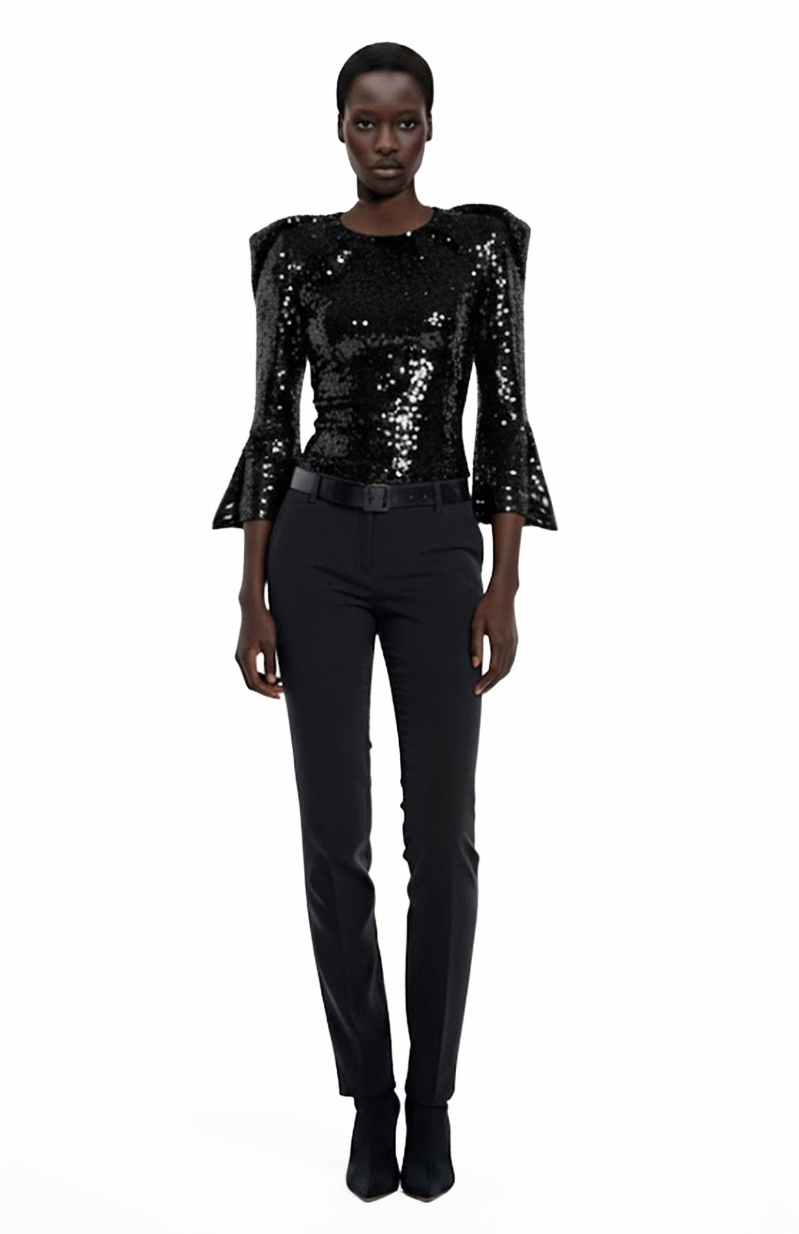 A: This bodysuit requires dry cleaning only to preserve the sequin detailing and maintain the integrity of the fabric. Professional care will ensure the garment retains its shimmer and structure.
