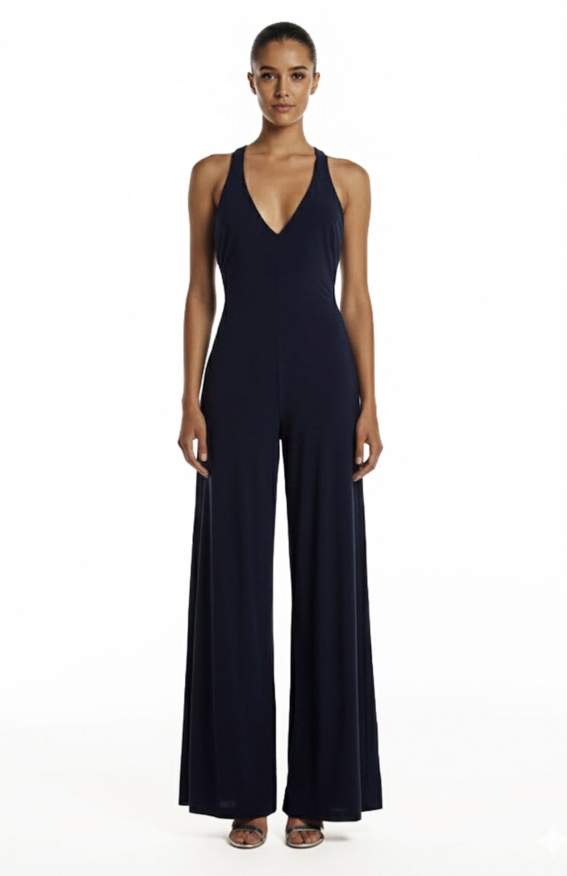 model is wearing a deep V neck navy jumpsuit