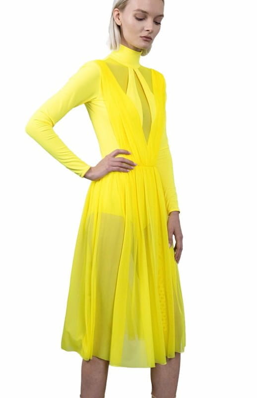 A: The Nera turtleneck knit dress is a classic with a twist style you will love. This sexy chic bodysuit dress will get you compliments every time you wear it. Appropriate for theatre nights, elevated dinners, gallery openings, cocktail evenings, or understated events with presence. The long sleeves and high neck balance the sheer areas making this dress elegant and edgy. Fully lined with a center-back zipper opening and snap fastening for the bodysuit crotch, it comes with a separate underskirt that provides more coverage if preferred.