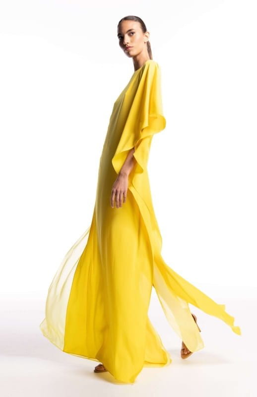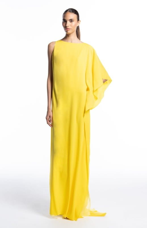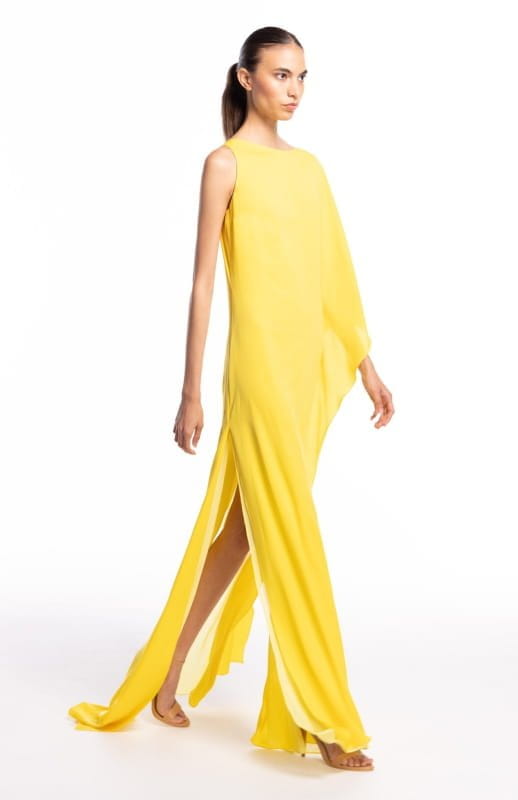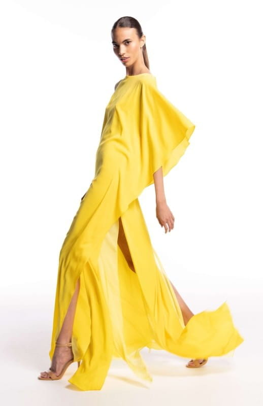 A: The Osiris dress is an elegant, asymmetrical sleeve dress that captures attention. Crafted from the finest silk georgette, the dress features a breathtaking silk chiffon underlayer and high slits that create ethereal movement with every step. Fully lined for added comfort and cover. Perfect for evening receptions, destination weddings, museum galas, formal events, or any occasion where you want to make a sophisticated statement with understated elegance.