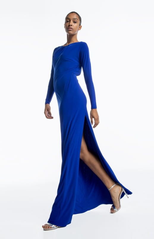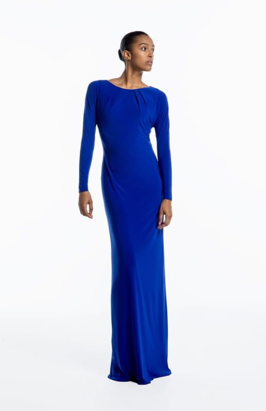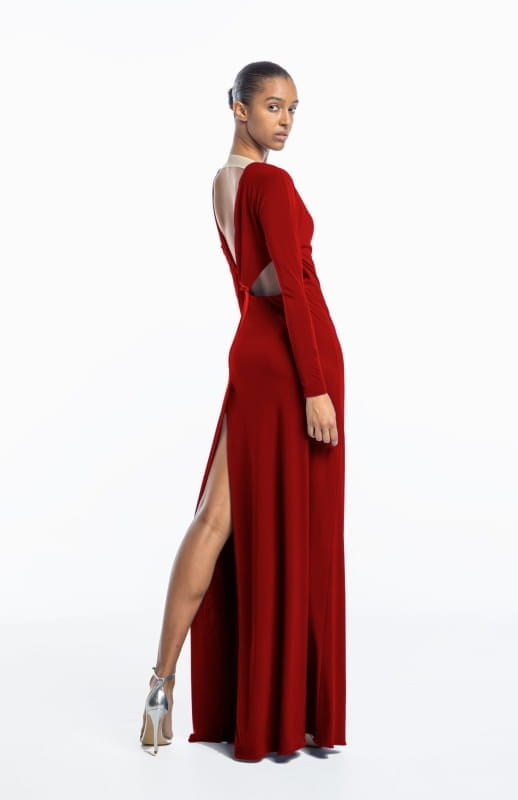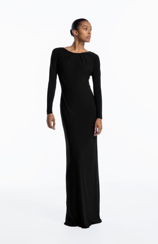 Promethea is a chic long dress that combines drama with comfort. Its clean, statuesque front allows the striking cutout back design to center stage. This dress will enable you to make a memorable exit. It is a classic piece with a twist that you can wear for years to come, ensuring you will steal the limelight every time you wear it.